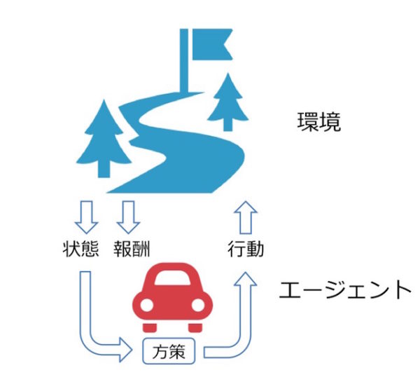 今まで仕事でも教師あり学習や教師なし学習などを取り扱うケースは多かったが、機械学習のもう一つの手法の強化学習についてあまり触れたことがなかったので整理してみた。ある行動を起こして、それに対しての結果からの報酬や価値を最大化する形で学習していく手法で、将棋AIや囲碁AI、自動運転とかで使われている。子供が自転車でこけたり、うまくいったことを経験しながらだんだんと自転車が乗れるようになっていくようなイメージで、人の学習プロセスに近い。わかりやすい本(つくりながら学ぶ!深層強化学習:小川雄太郎著:マイナビ出版)があったので、それをもとに実際に試してみる。
