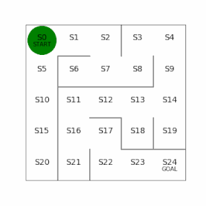 行動価値の求め方の違いによって、SarsaやQ学習のアルゴリズムが変わってくる。以下はQ学習での5×5迷路で、300回(エピソード)学習した結果。状態価値が毎エピソードを通じてどのように変わっていくかをヒートマップで示している。方策反復法と違って学習時間はかなり短い。
