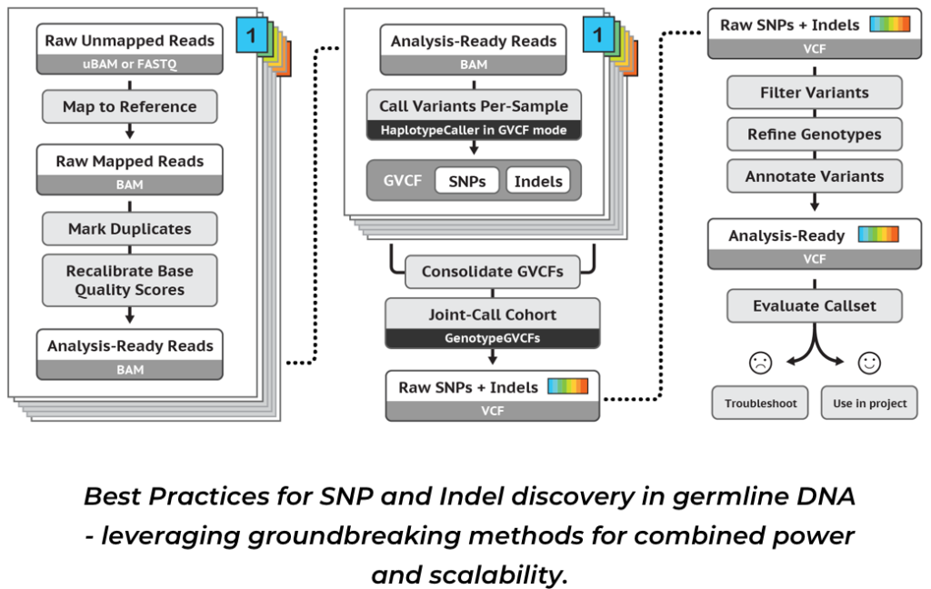 バリアントを検出する際にReferenceとなる参考配列と異なる部分を検出することをバリアントコールと呼ぶ。バリアントコールを学ぶために、UCLAのYoutubeの動画があったので、こちらを元に整理してみる。遺伝子多型は、生殖細胞と体細胞の両方で発生するが、この動画では生殖細胞に絞って、GATKを使ったレクチャーを行なっている。GATKはショートバリアントを検出して、VCFフォーマットで出力するプログラムであり、以下のフローでバリアントを検出する。