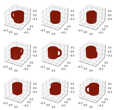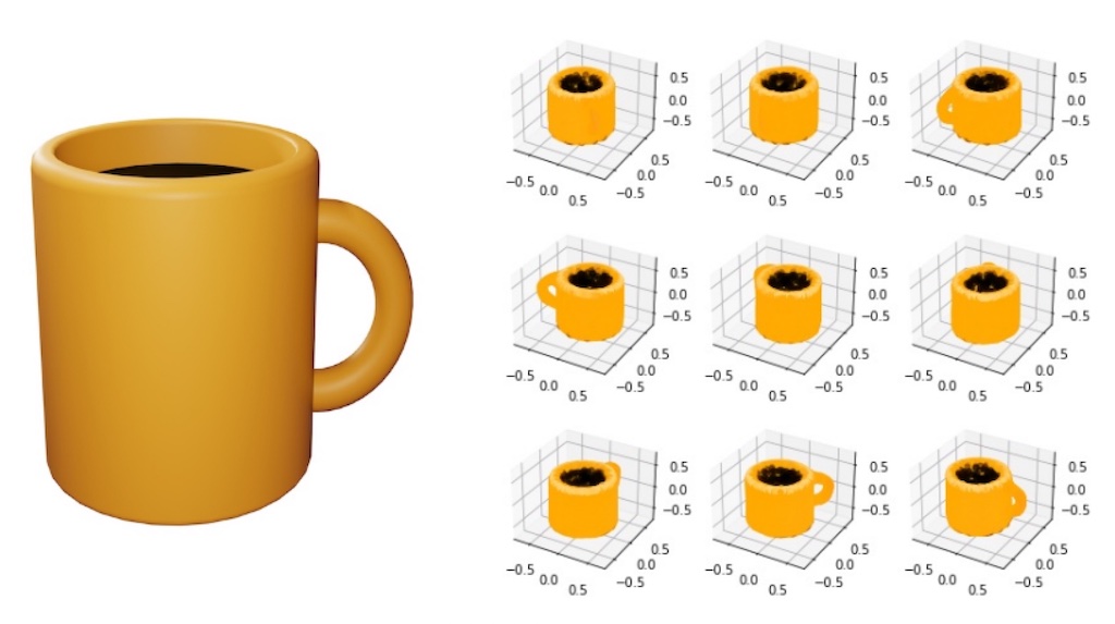 環境はGithubに公開されているimage2pointcloud.ipynbをそのまま利用。イラストはフリーのマグカップの画像を使用した。左が入力画像で、右が出力画像。このように色々なアングルからの画像を出力してくれる。
