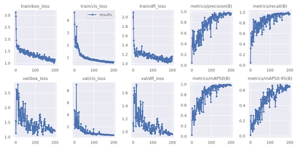 その後に、事前学習済みのモデルをロードし、学習条件を設定するだけで学習を実行してくれる。モデルはYOLOv8lを使用。今回Epoch数は200回に設定、GPU使用で時間は大体50分ぐらいで終わる。