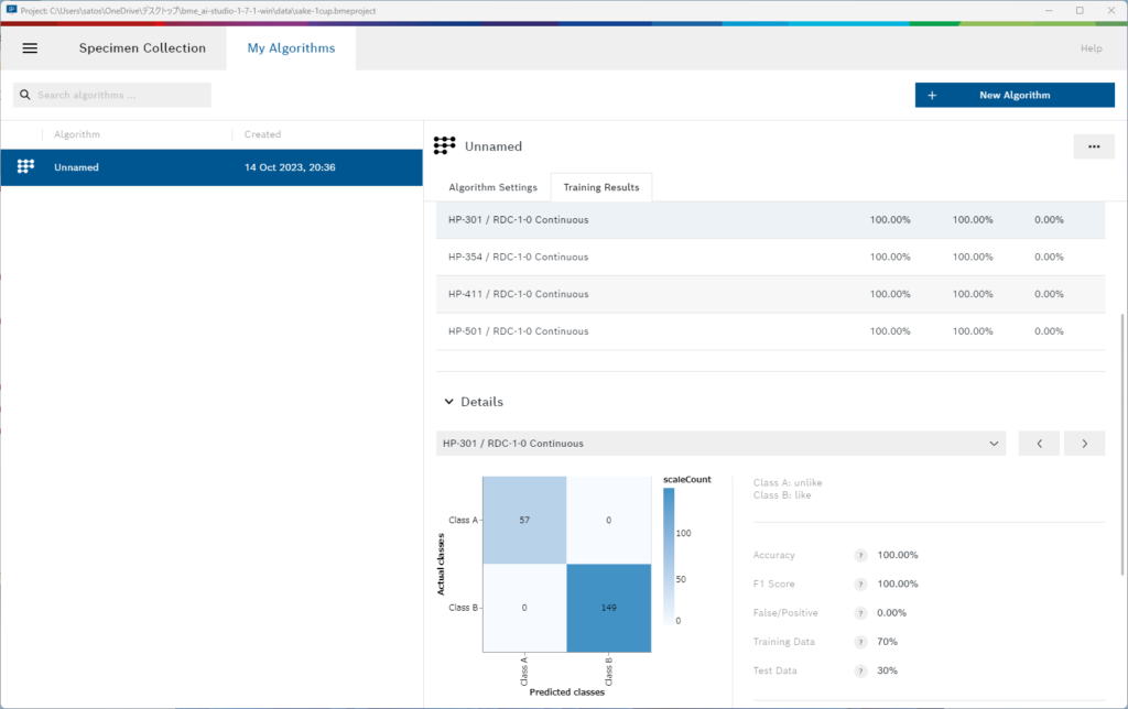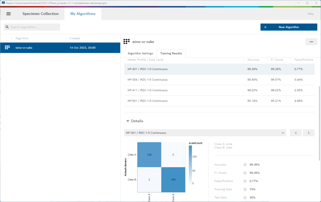 まず最初にワインと日本酒の違い。日本酒は田酒と福寿の2種類をデータに使用している。AI-Studio Desktopではデータを指定して、ラベルをつけると識別モデルを作成してくれる。簡単なNNベースのもので学習させているようである。結果は以下のとおり。4つのプロファイルごとに結果が表示されている。いずれのプロファイルでも95%を超えており、高い精度が出ている。