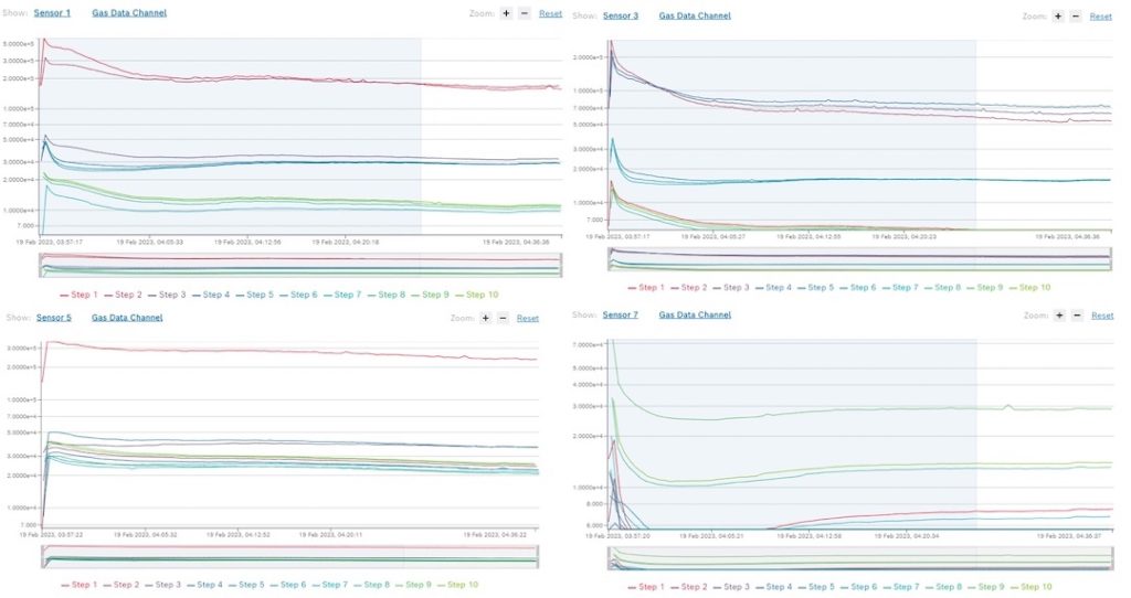 それぞれ約30分間データを採取する。以下は田酒の4つのセンサーのデータだが、それぞれプロファイルが異なるので、違った波形を示している。